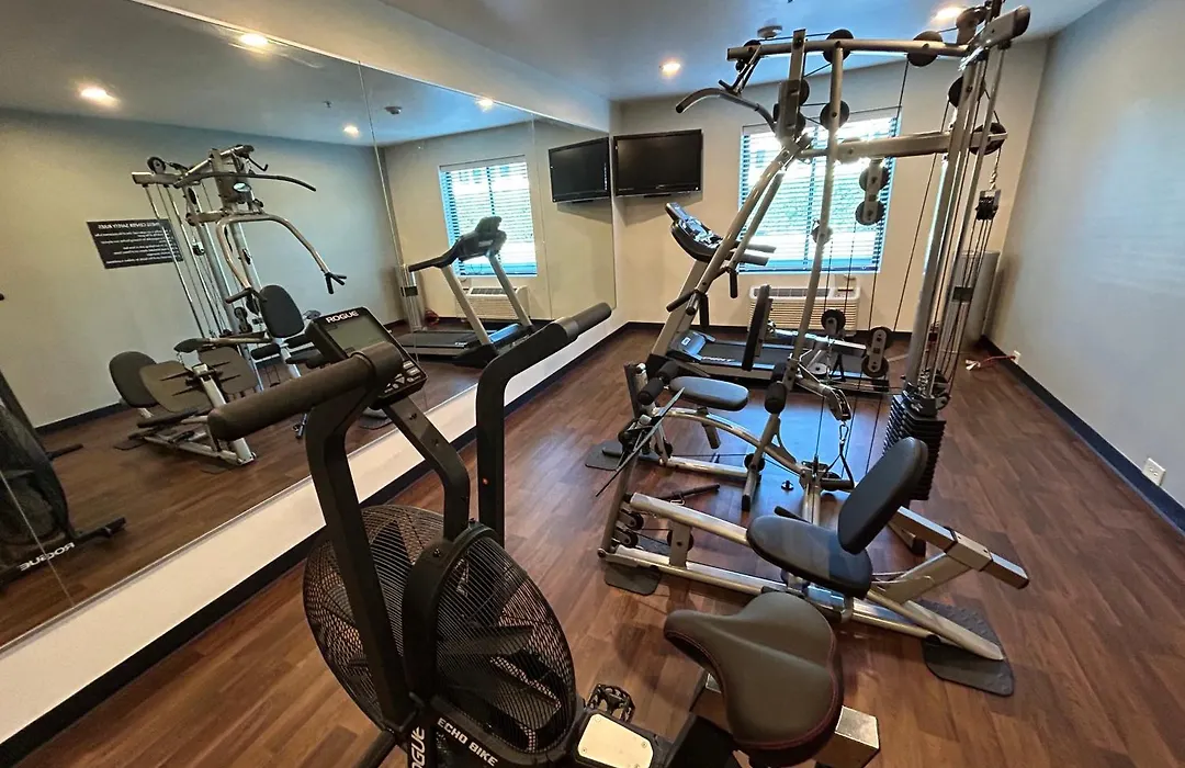Guests can work out in a fitness area or relax by a swimming pool.
